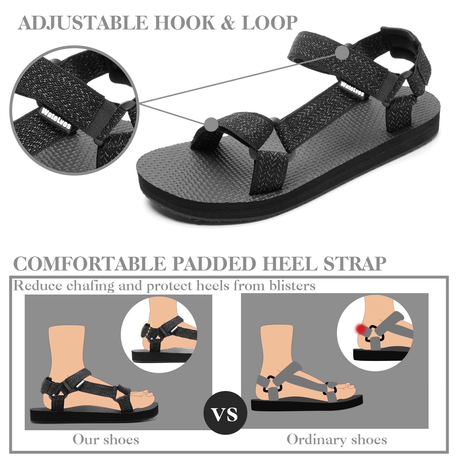- INGENIOUS WEBBING DESIGN:Durable and tear-resistant polyester ribbon that dries in minutes. The hook and loop buckles are easy to adjust with straps placed in comfortable positions and a padded heel to reduce chafing or blistering.